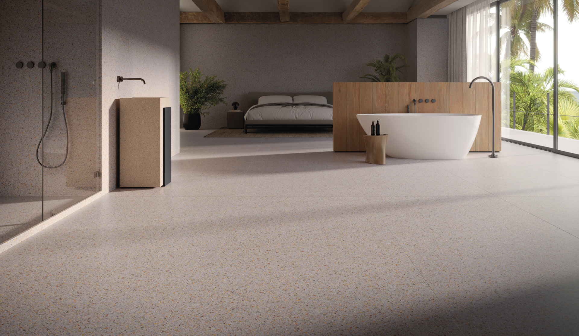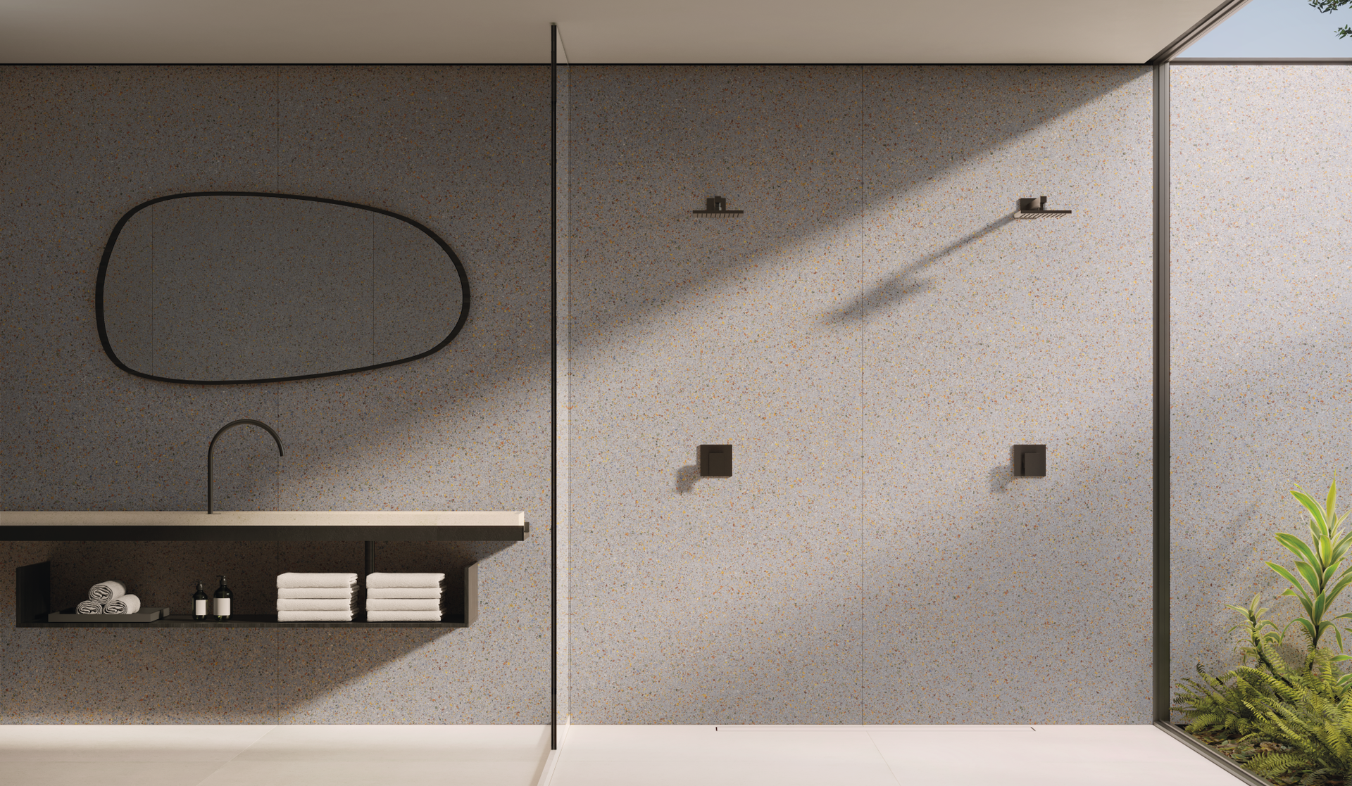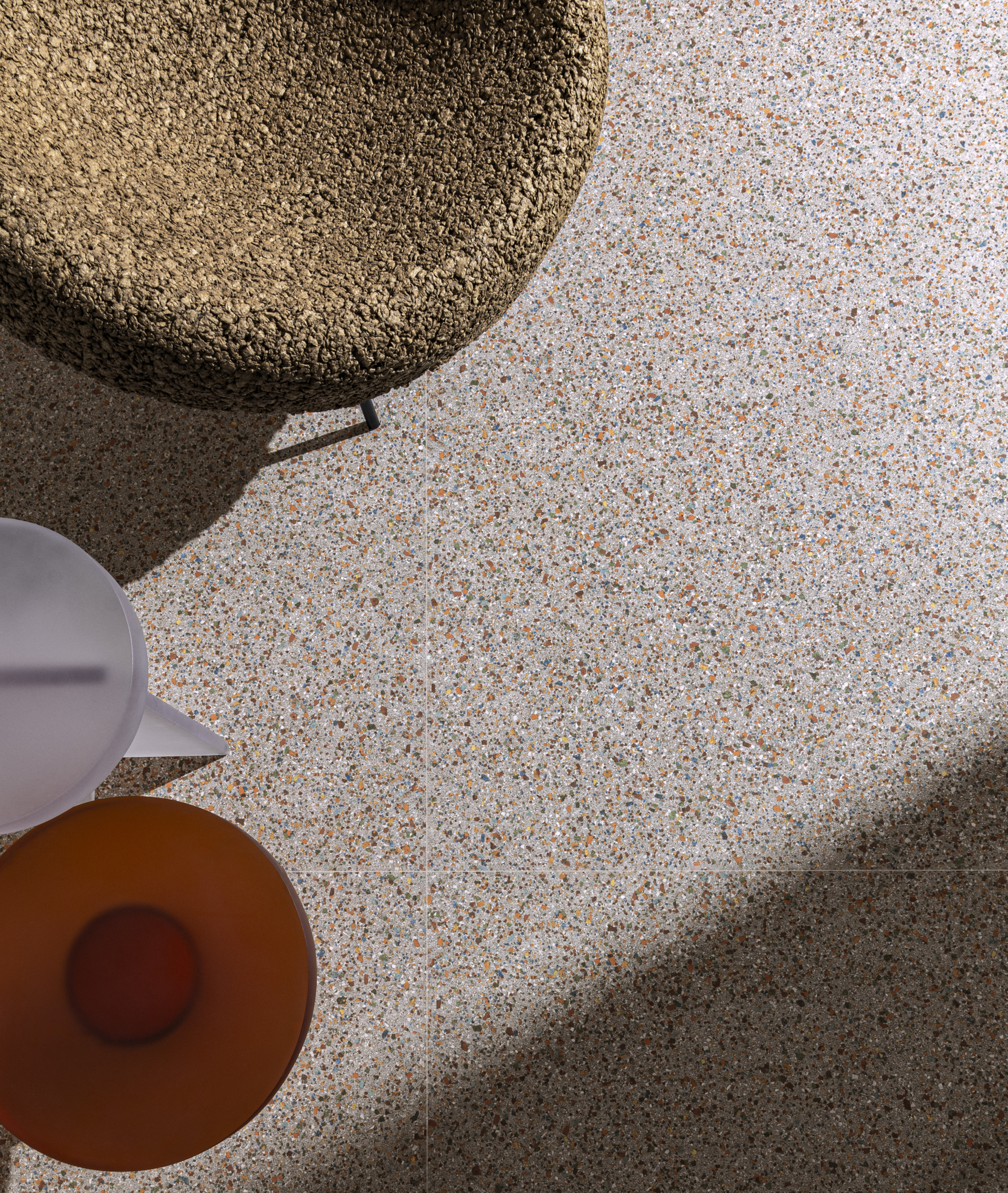 Já em Bordas, placas cimentícias robustas, de superfície e contornos irregulares, evocam o imperfeito do fazer artesanal, quase rústico.